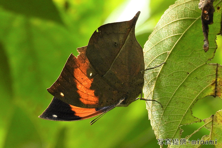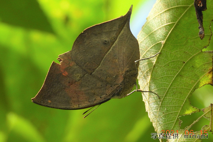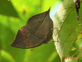 枯れ葉に擬態したタテハチョウ。 裏の翅は枯れ葉そっくりだが、表の翅は美しい色彩をしており、青い地色にオレンジ色の帯がある。 林内の湿った環境を好む。 「山田農道脇の湧き水付近木の上でとまっていました。」 |