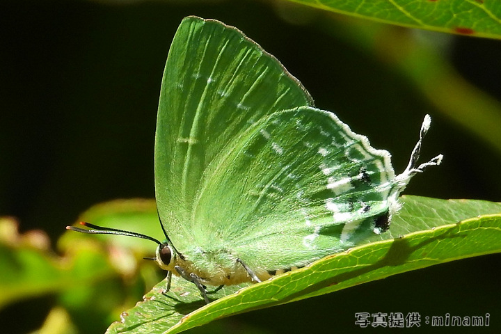 緑色が美しいシジミチョウ。 ♂の翅の表面は黒褐色で基半部は紫青色。 ♀の表面は暗褐色で後翅外縁付近に白斑列がある。 主に夕方活動する。 「ナカハラクロキにとまっていました。」 |