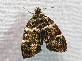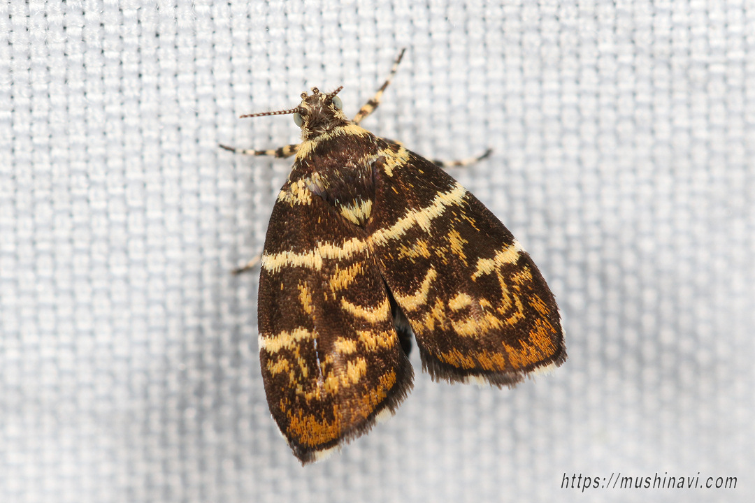 焦げ茶色に黄白色の横条が特徴のハマキモドキ。 前翅の地色は焦げ茶色で黄白色の横線があり、下の1本は中央で途切れる。 前翅外縁沿いは橙色。