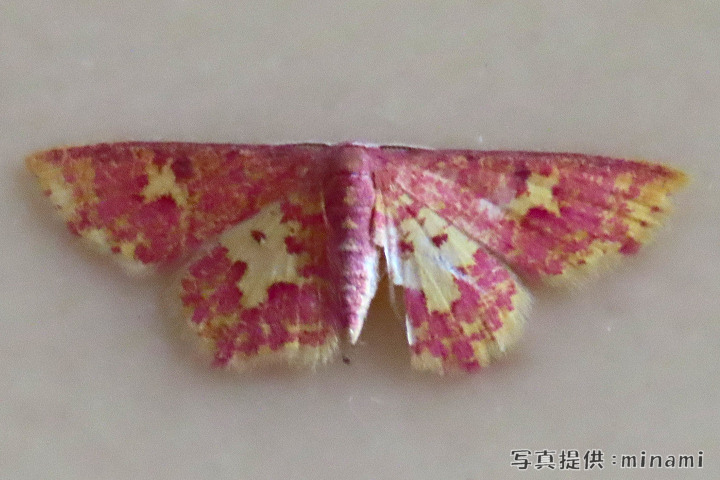 紅色の模様が綺麗なヒメシャク。 地色は淡黄色で、前翅から後翅にかけて中央にピンク色の横帯があり、後縁もピンク色で縁取られる。 和名のビンガタは沖縄の染物の紅型(びんがた)に由来するとされる。