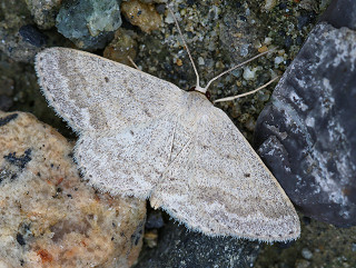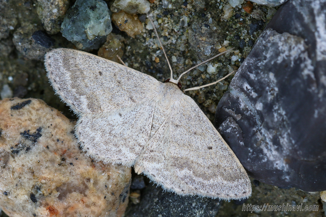 小型のヒメシャクの一種。 前・後翅の地色は淡灰褐色。 前翅の外横線は太い帯状。 海外では台湾,朝鮮半島,中国,ロシア南東部に分布し、国内の本種は日本産亜種。 |