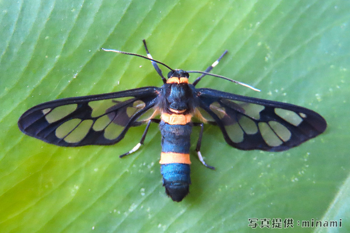カノコガの一種。 本土のカノコガより小型で翅の斑紋の透明度が高い。 東南アジア原産で台湾から与那国島に侵入し、分布域を広げている。 国内に生息するSyntomoides属は本種のみ。 「自宅庭のバナナの葉に止まっていました」 |