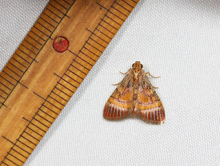 輪状の黄色い帯が特徴的な美しいフトメイガ。 全体的に淡い橙黄色をしており、外横線は太く孤を描き、濃い紫色の線で縁取られ、更に周囲は淡色。 海外では台湾,朝鮮半島,中国,ロシア南東部,ネパールに分布している。 国内に生息するLista属は本種のみ。 |
