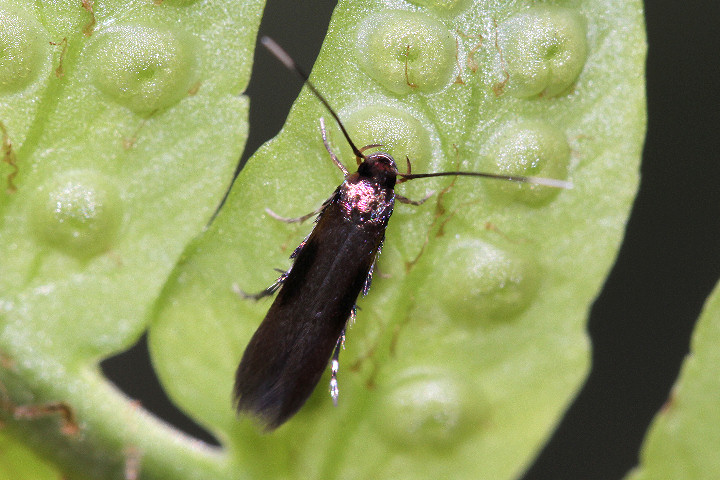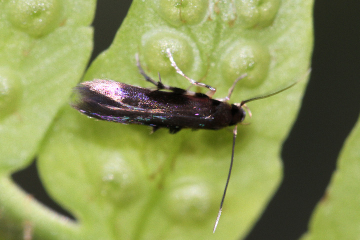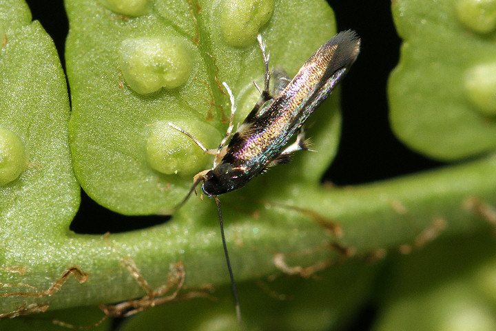 シダ類に集まるニセマイコガの一種。 体色は暗紫褐色で虹色の金属光沢がある。 前翅前縁中央付近に暗色部がある。 触角は黒色で先端付近は白色。 同属のクロシダマイコガと酷似し明確な判別点は不明だが、寄生するシダ類の種類が異なる。