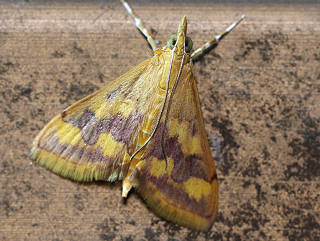 シソ科植物を食草とするノメイガの一種。 黄土色に紫色を帯びた暗赤褐色の帯模様がある。 幼虫は、シソ科の葉を綴る。冬は枯れ葉や枝などを綴って幼虫で越冬するという。 海外では台湾,朝鮮半島,中国,東南アジア,ネパール,インド,オーストラリア,北アメリカ,ドミニカ,南アメリカに分布する。