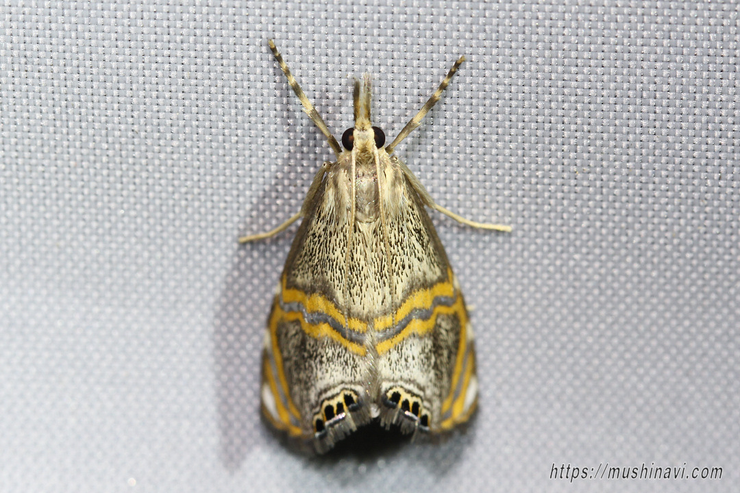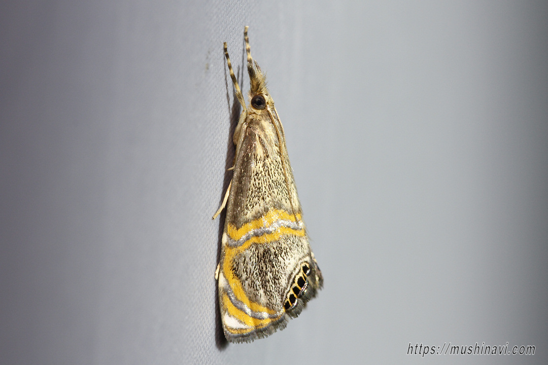 橙黄色の横帯が特徴的なツトガの一種。 地色は黄白色で黒色の鱗片が散布される。 前翅中央よりやや後方に2本の橙黄色の帯があり、中間は銀色。 後方の横帯は前縁付近で大きく湾曲し、外縁まで伸びる。 前翅外縁の中央から後角にかけて、黒紋が6個並ぶ。 同属のソトモンツトガと酷似し、外観上の区別は困難とされる。本ページの個体は分布域から本種と同定した。 比較的珍しい種とされる。