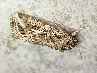 害虫として知られているキリガの一種。 前翅は褐色で淡色の筋模様が目立つ。 触角は♂は繊毛状,♀では糸状。 広く分布しているが、寒さに弱く寒冷地では越冬できない。ただし、移動能力に優れているため、海外から飛来することもあるという。 幼虫は野菜類を食草とするため、害虫とされている。 幼虫は体節毎に黒紋があり、特徴的な模様をしている。 海外では台湾,朝鮮半島,中国,ベトナム,インド,スリランカ,インドネシア,オーストラリアなどに分布している。