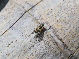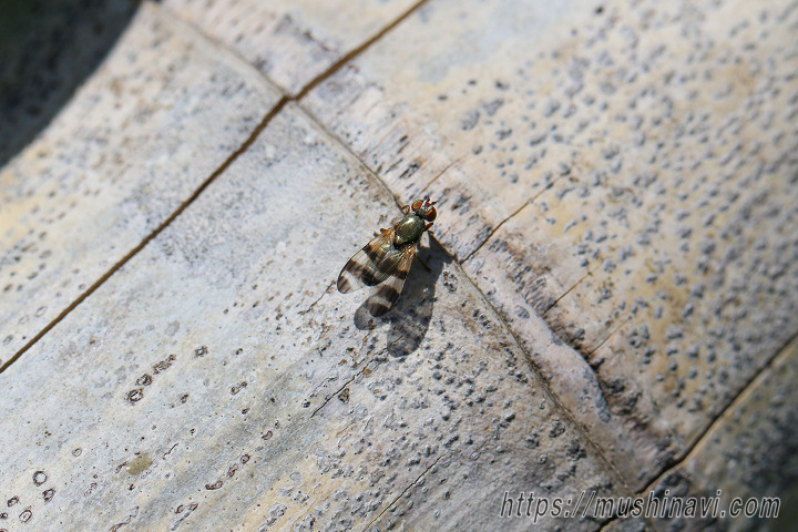 ハネフリバエの一種。 胸背は緑がかった銅色の金属光沢がある。 翅は3本の黒い横帯がある。 日本産の目録上には属も含め該当する種は見当たらず、Chaetopsis属(特にChaetopsis fulvifrons)にそっくりな画像が海外のサイトから多数見つかり、同属と判断した。 |