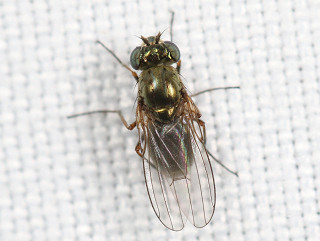 ミギワバエの一種。 体色は鈍い金属光沢のある緑味がかった銅色。 水辺付近に棲息し、外灯にも飛来する。