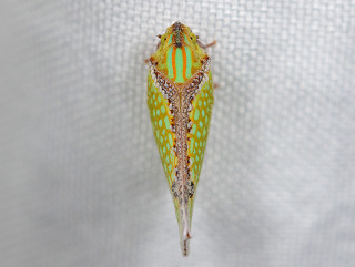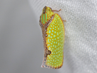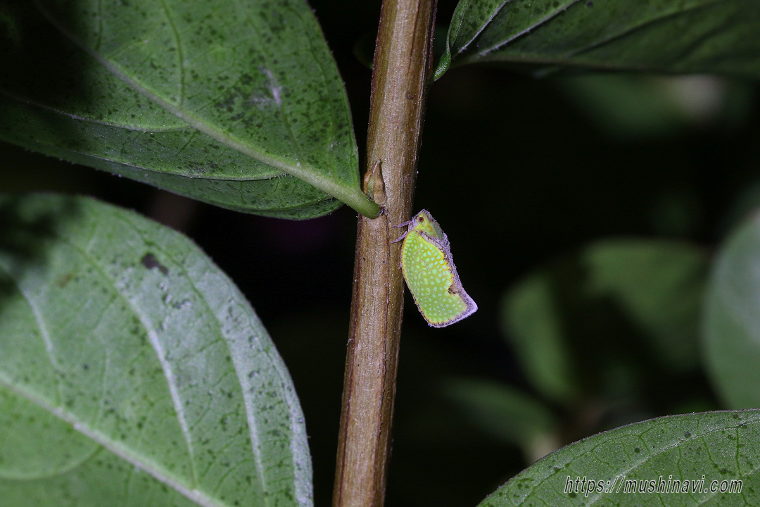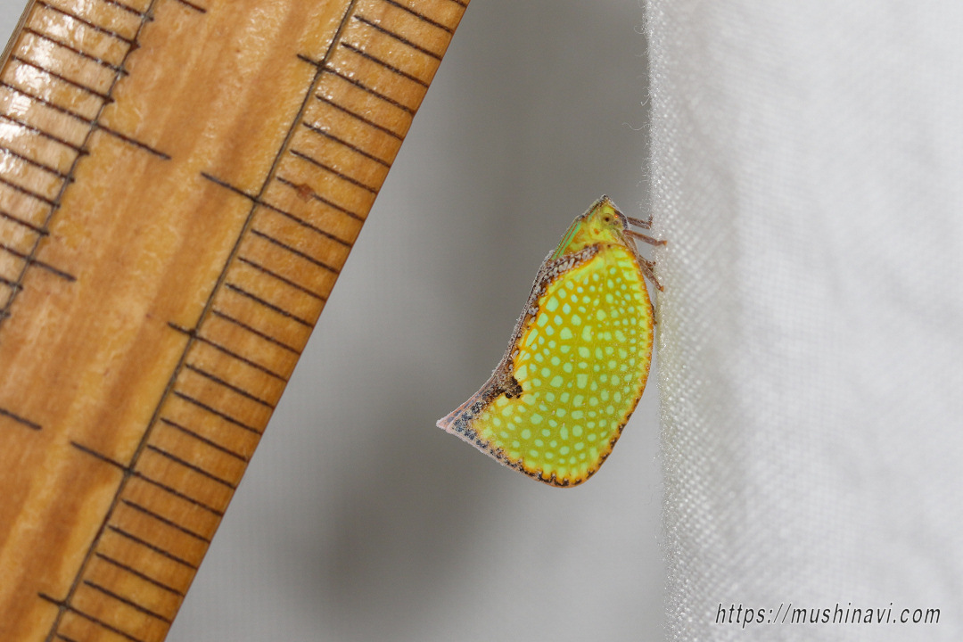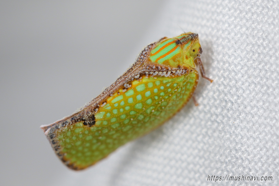 | 解説 | 外来種のアオバハゴロモの一種。 前翅は明るい黄褐色と青緑色の網目模様があり、縁沿いは茶褐色。 胸背は青緑色の地に2本の鮮やかなオレンジ色の縦筋がある。 近年、海外から侵入した種で、朝鮮半島・中国南部・台湾・東南アジアに分布していると思われる。 幼虫は成虫と同様に青緑色の地にオレンジ色の縦筋があり、アオバハゴロモと同様に白色のロウ質物を纏うが、頭部と胸背、腹部の一部はむき出しになっている。 国内に生息するSalurnis属は本種のみ。 |