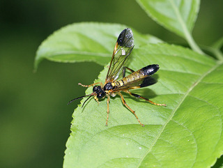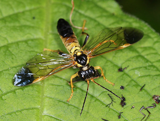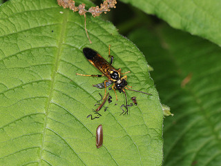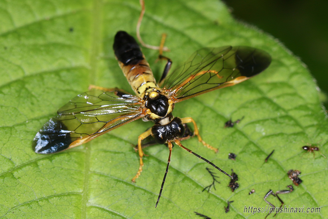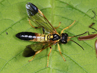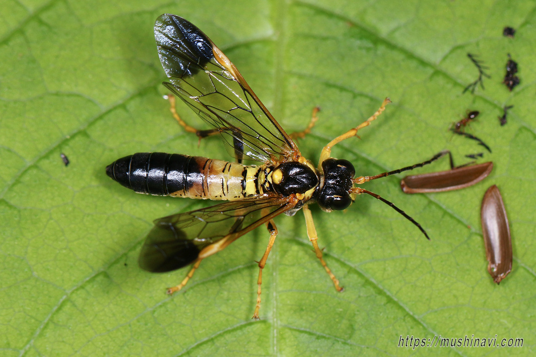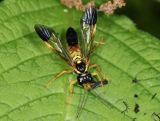 ハバチの一種。 前翅先端・腹部後方・頭部・胸背は黒色。 小楯板と腹部第1〜3節は黄色。 幼虫はセリやミツバを食べるという。 |