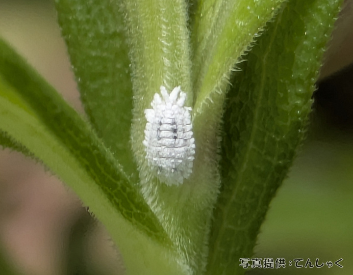 外来種のコナカイガラムシ。 ♀は白色ロウ質物で覆われているが、前方に1対、後方に3対程の黒色部がある。 ♀は不完全変態だが、♂は前蛹・蛹・成虫と完全変態する。 各種野菜類に寄生するため、害虫とされている。 中南米原産の外来種と思われ、2009年に沖縄島で発見され以来、分布域を広げて問題となっている。 「マンションの近くを通ろうとした際に植物の茎にいた本個体に気付き撮影」 |