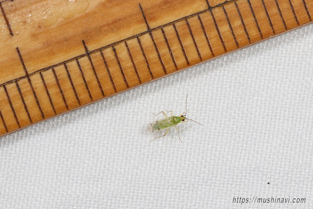 シダカスミカメの一種。 緑色で革質部後方と膜質部の翅脈付近に暗色の斑紋がある。 熱帯アフリカ原産の外来種と考えられている。 国内に生息するNesidiocoris属は本種のみ。 |