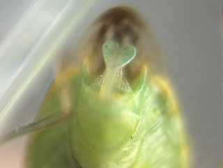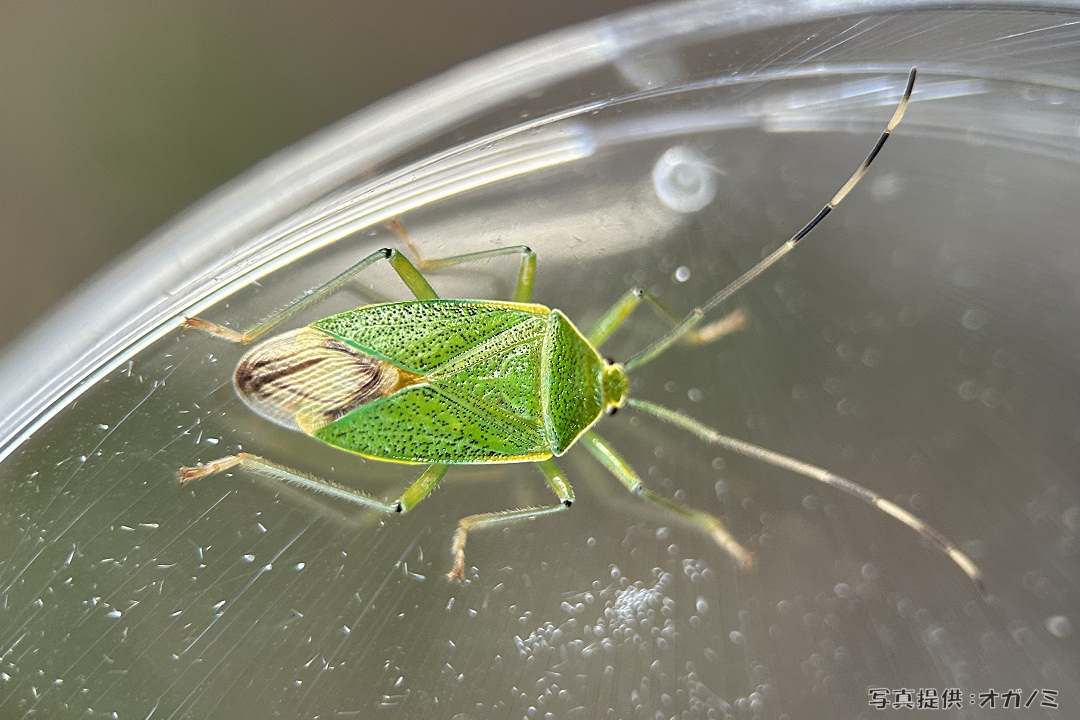 クヌギカメムシ科の一種。 緑色で長い触角を持つ。 同属の仲間と酷似するが、♂の生殖器の中央突起の先端が広がりサジ状になることで区別できる。 ♀では腹部末端に1対の大きな棘状突起があることで区別できる。 海外では朝鮮半島,極東ロシア,中国北部に分布している。
