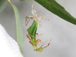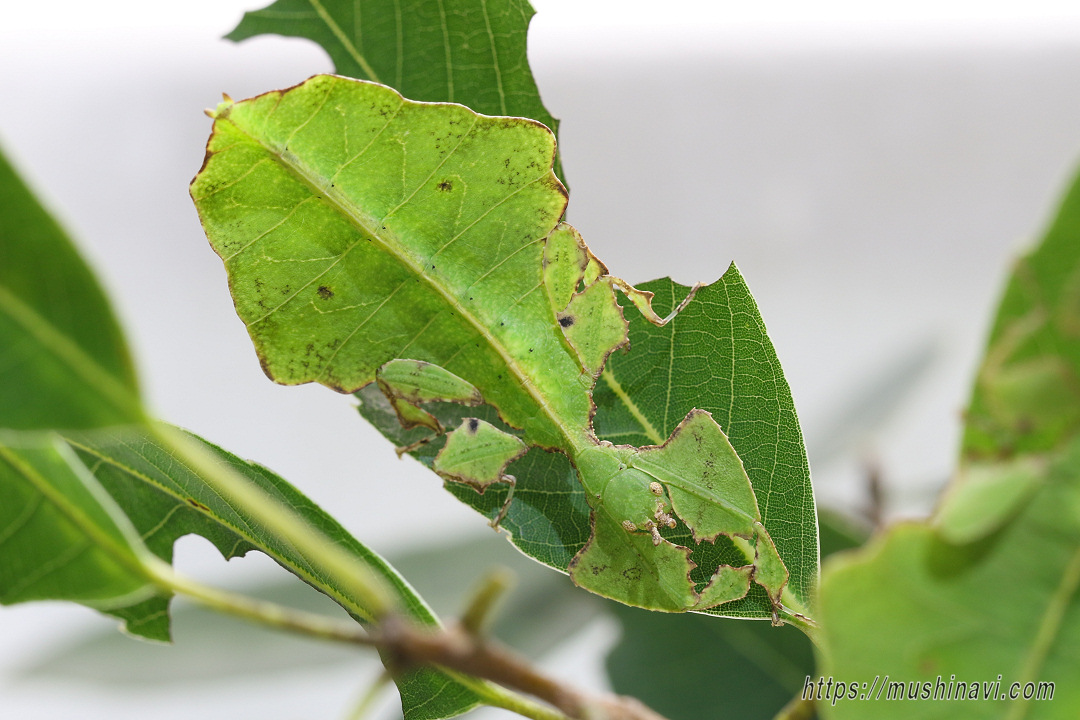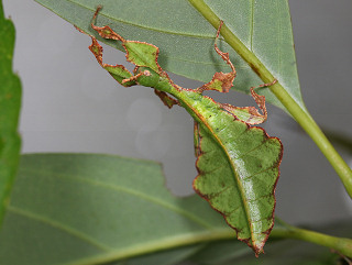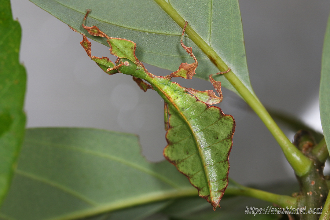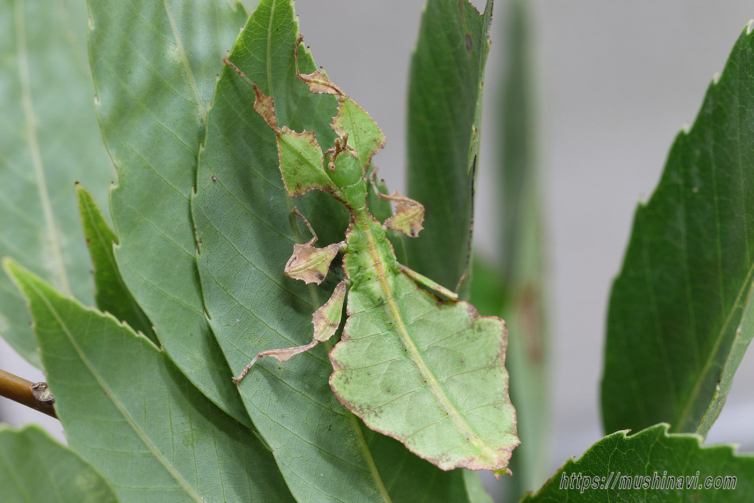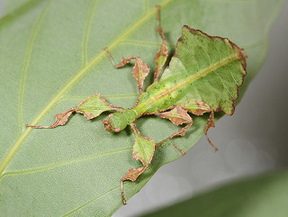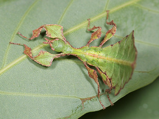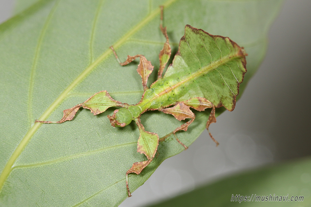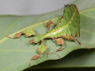 葉に擬態したコノハムシの一種。 コノハムシの中で本種は最大となる。 腹部と翅は大きな葉そっくりで、脚も板状に広がり葉を表現している。 ♂は稀で、通常♀が単為生殖する。 植物防疫法で現在輸入は禁止されているが、国内では禁止前に輸入されたものが出回っている。 近年代用できる食草が明らかになって飼育が盛んになっている。 |