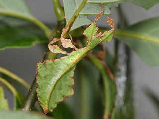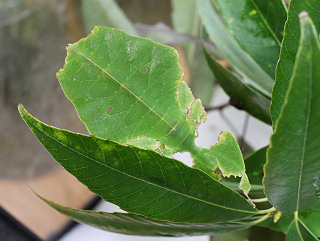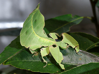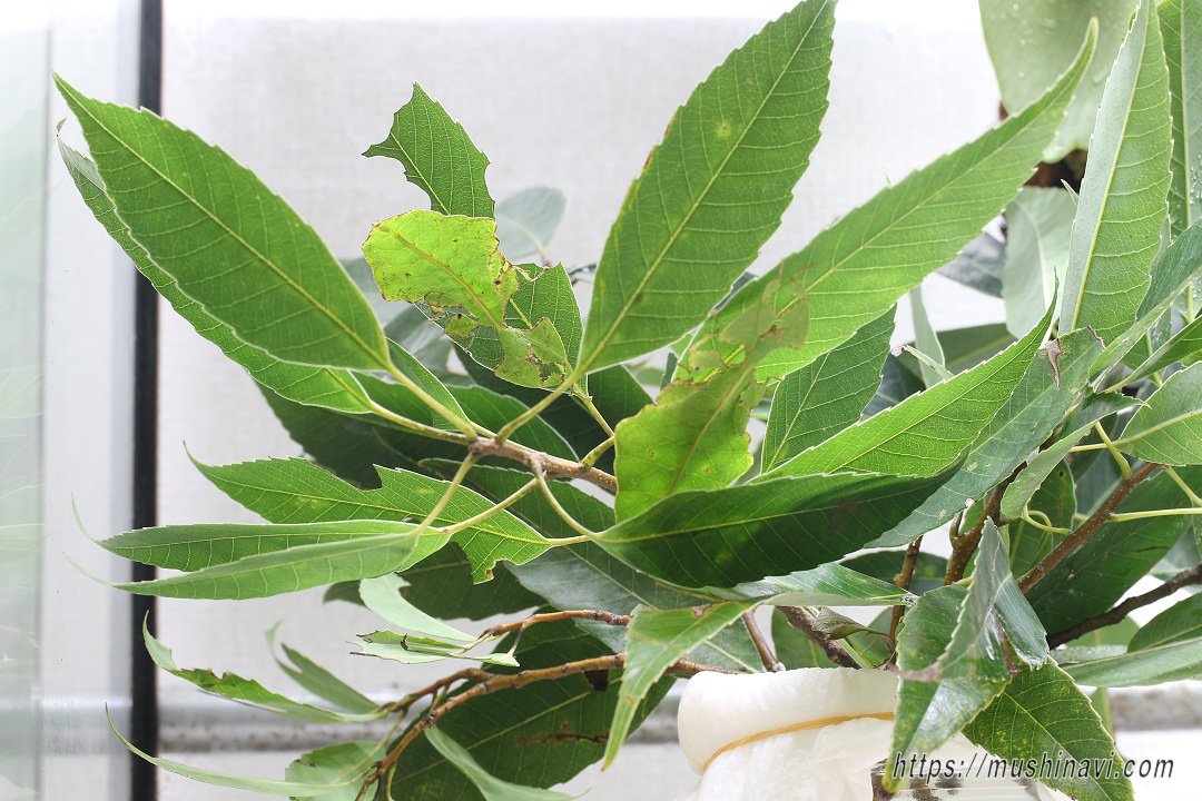 ブナ科(オーク),バラ科(キイチゴ),フトモモ科(グァバ)などの葉 飼育下ではブナ科(シラカシ,アラカシ,クヌギ,コナラ,マテバシイ),ツツジ科(レモンリーフ)。 |
