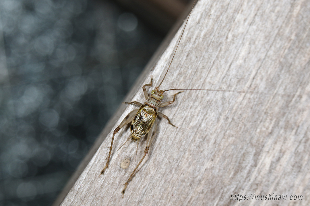 小型の樹上性のコオロギの仲間。 ♂はチリリリリと鳴く。 全体的に白っぽく、後脚内側には黒い紋がある。 本種の♀は近縁種のウスグモスズに似るが、本種にある後脚内側の黒い紋が、ウスグモスズには無いことで区別することができる。