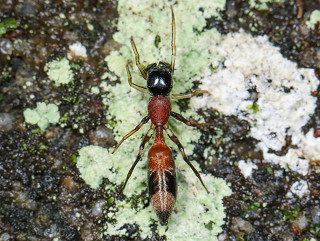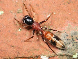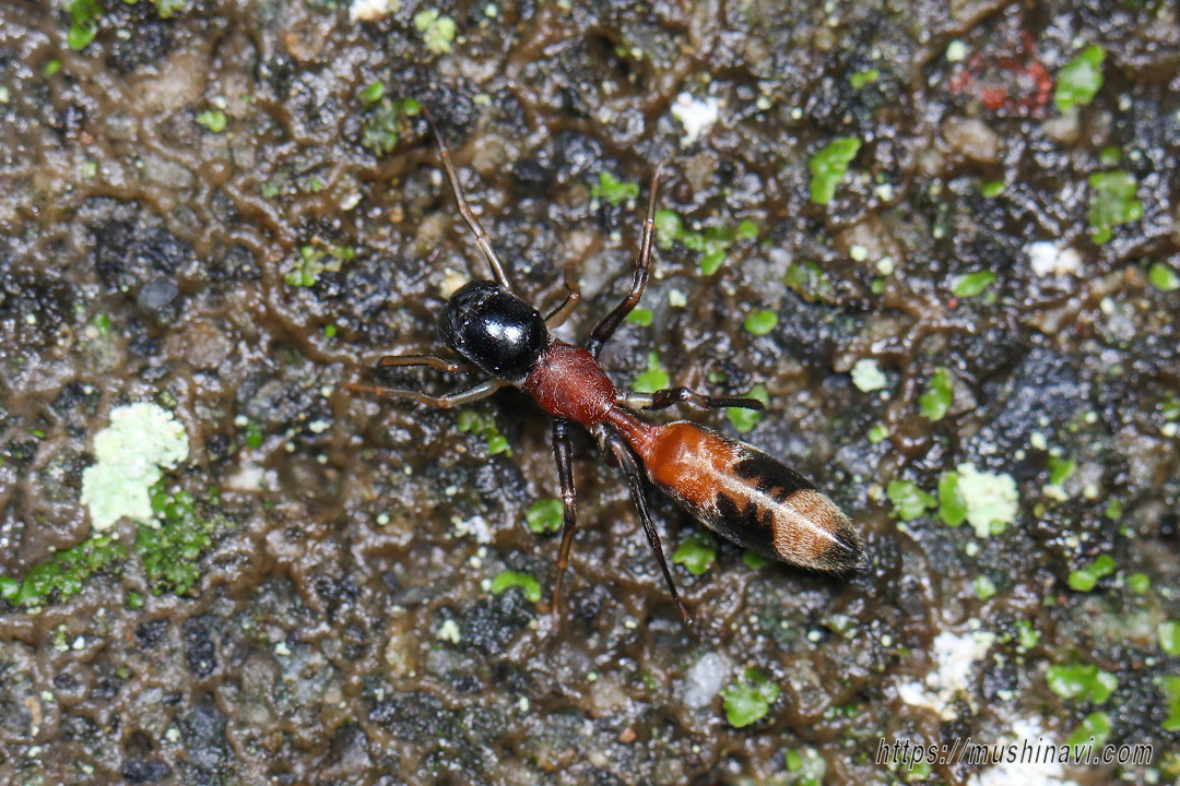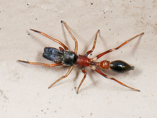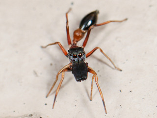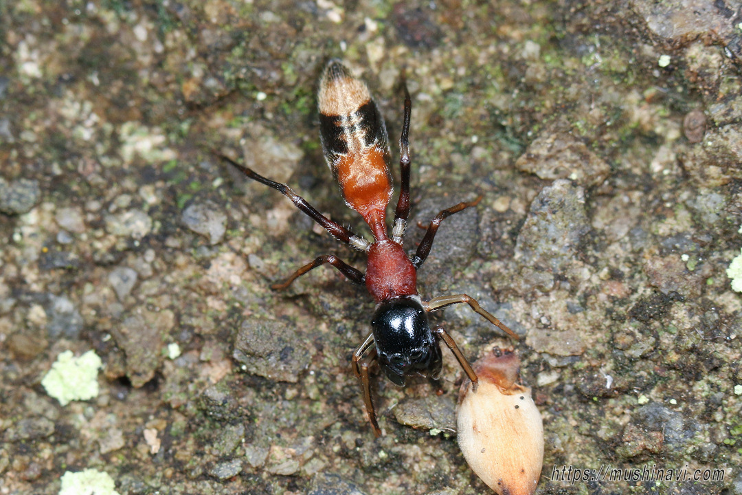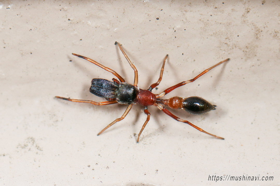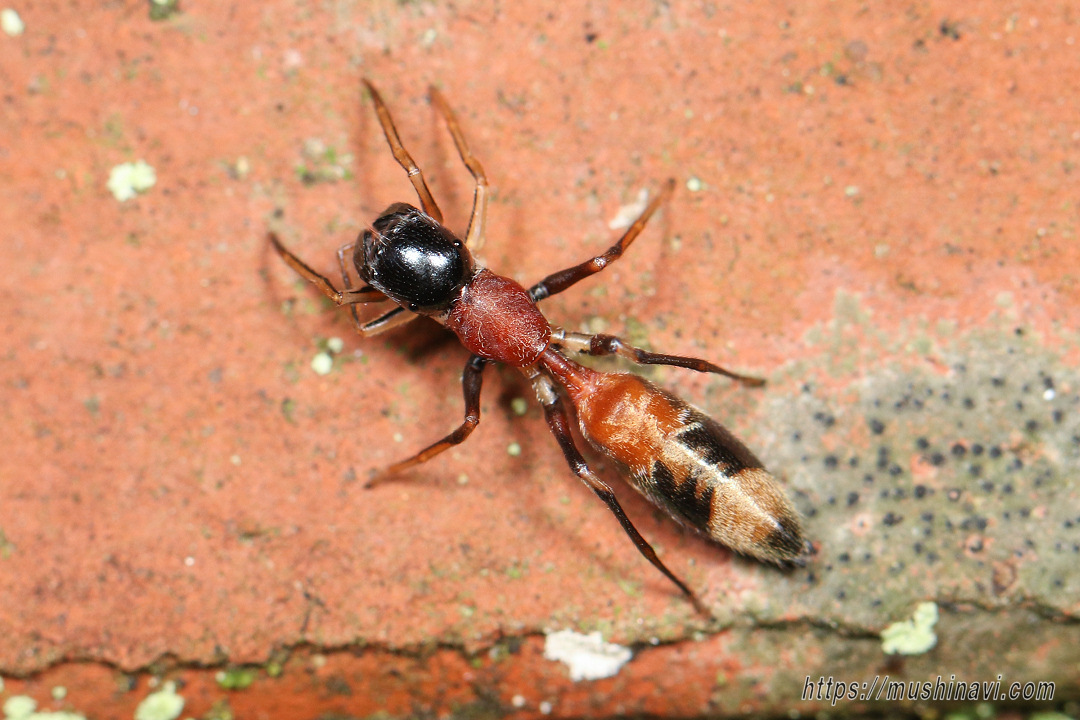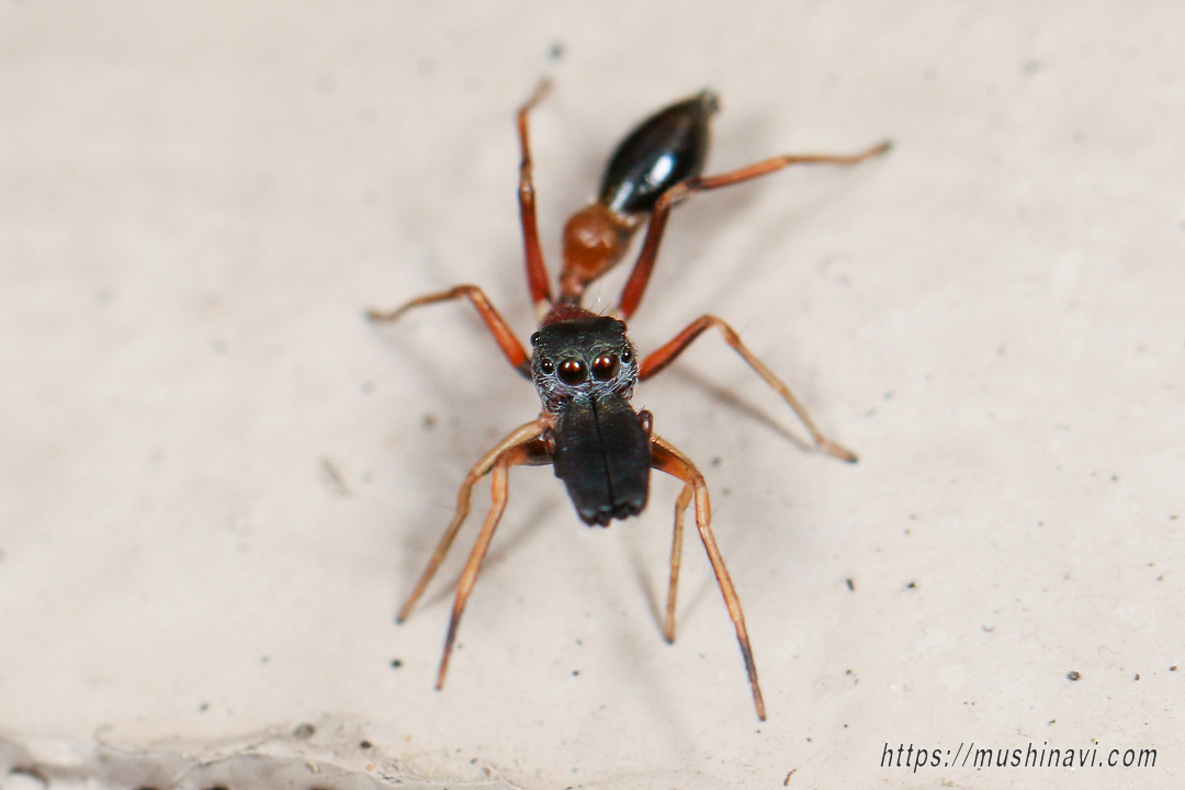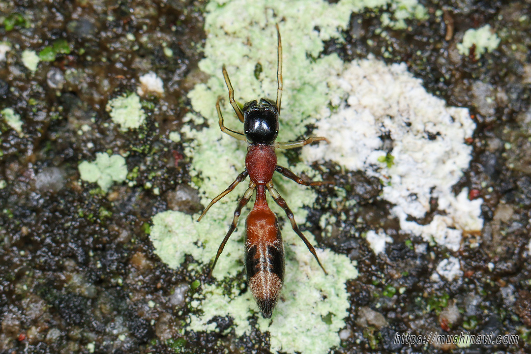 アリそっくりなアリグモ属の仲間。 頭部は黒色、胸部は橙褐色。 腹部背面は橙褐色の地に中央に黒色の横帯があり、個体により矢印模様がある。 体色に個体差もあり、全体的に黒色になる個体も出現する。 ♂では上顎が大変発達するが、♀では発達せず、よりアリと間違え易い。