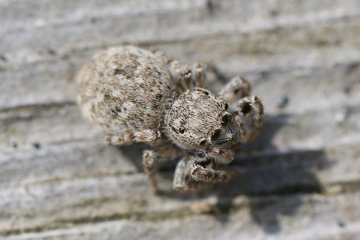 ナミハエトリグモの一種。 雌雄で体色が異なり、♂は頭胸部後方から前方にかけてUまたはV字状の暗褐色の紋がある。 ♀では全体的に淡灰褐色で腹部背面中央付近にぼんやりとした縦長の暗色斑がある。 ブロック塀やコンクリート製の建造物など人工的な物に多い。 |