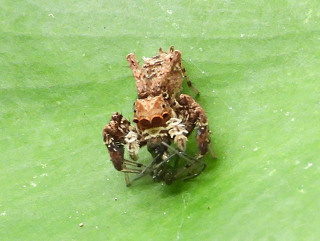 クモを食べるハエトリグモ。 ♀の体色は褐色で腹部背面後方に1対の淡褐色の立毛がある。 ♂は頭胸部が黒色で正中線上と側縁が白色。 多種のクモを捕食するが、特に造網性のクモを好んで捕食する。 国内に生息するアミカケハエトリグモ属(Portia)は本種のみ。 「クワズイモで餌待ち中♂かな?」 |