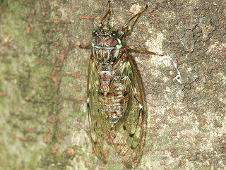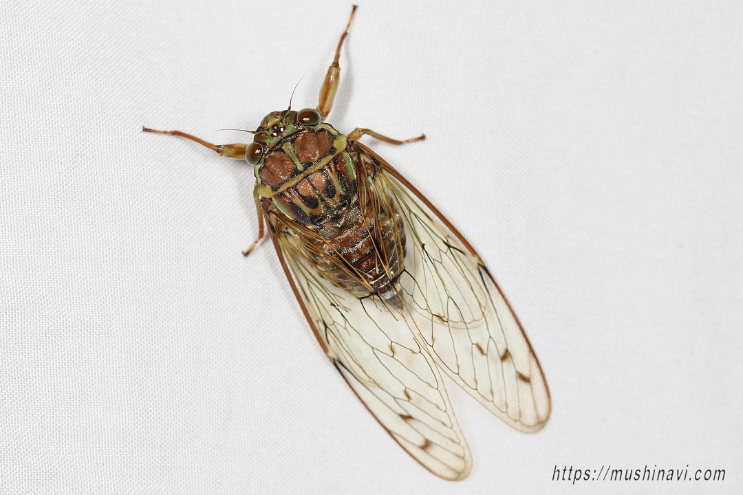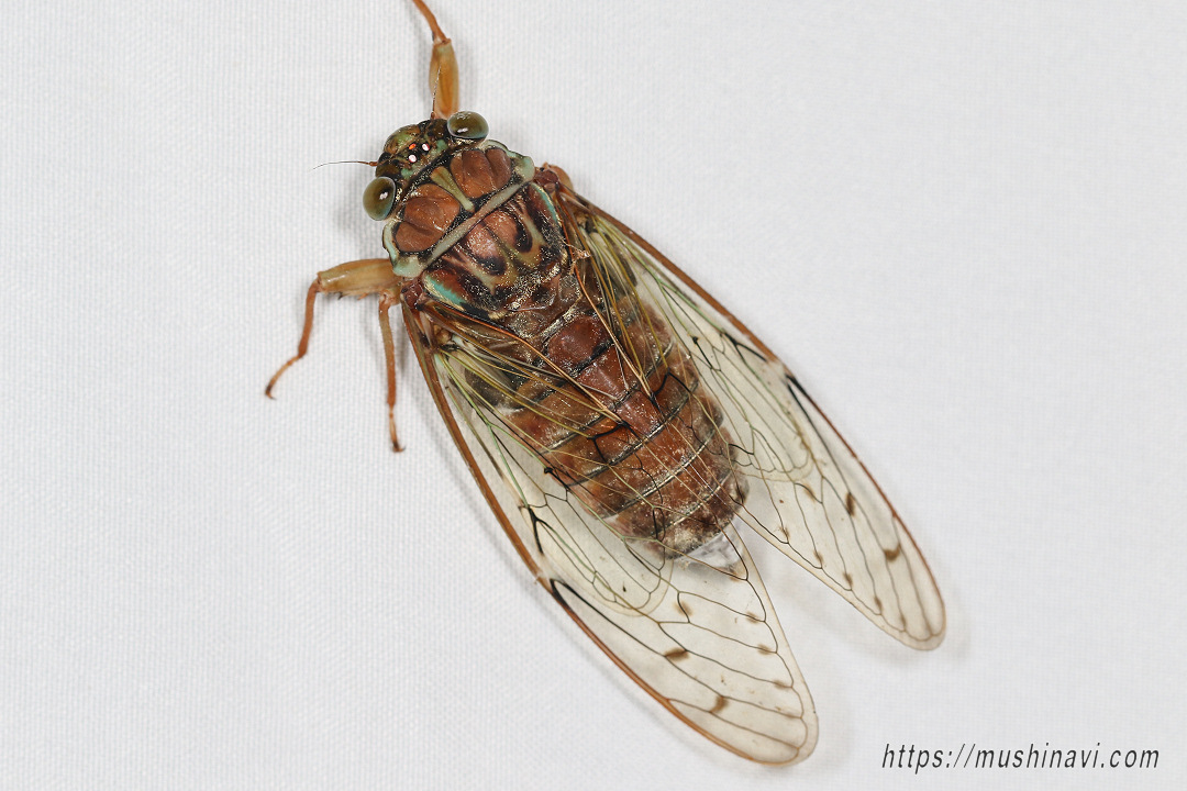 早朝や夕方に涼しげに鳴く中型のセミ。 カナカナ・・・と綺麗な声で鳴く。 胸部は赤褐色や黒色,薄い緑の装飾的な模様がある。