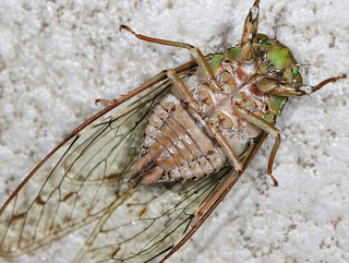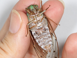 ![]() 羽化中の個体 夜の9時半頃、庭で羽化していた。 (2009.8.2) |