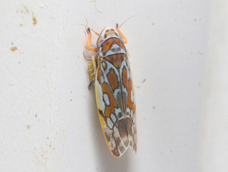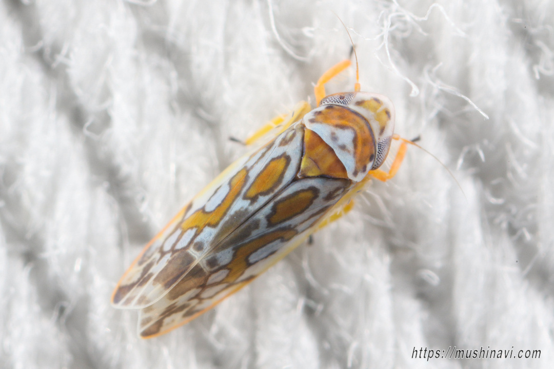黄褐色と灰青色の斑模様が美しいヒメヨコバイ。 前翅は暗灰色に縁どられた黄褐色模様があり、翅頂付近は暗灰色の斑紋がある。 美しい模様を持つが、頭部から翅頂までの体長は3mmと小さく、肉眼では目立たない。