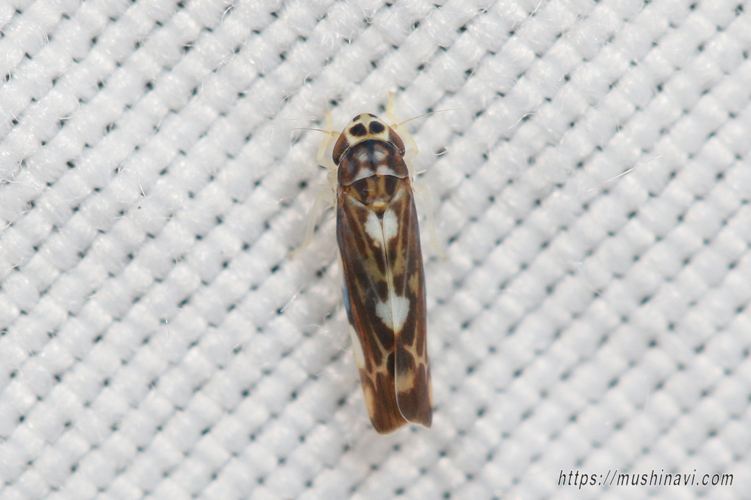 ヒメヨコバイの一種。 翅は暗褐色で翅脈上は褐色。白紋が前縁やや後方に1つ、後縁基部と中央付近に2つある。 頭部前方と胸部に2対の黒い紋がある。