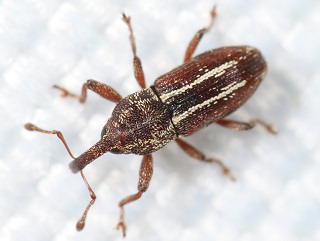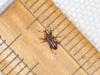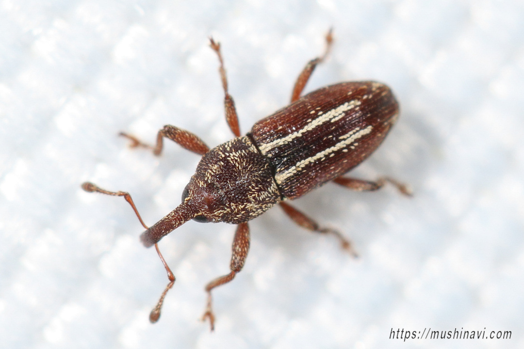 | 解説 | ヒメゾウムシの一種。 体色は赤褐色で上翅に1対の白色の縦筋がある。 比較的少ない種。